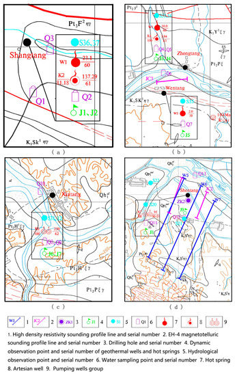 Layout of geological technical means and working methods in the geothermal fields of (a) Shangtang; (b) Zhongtang & Wentang; (c) Xiatang; (d) Shentang.