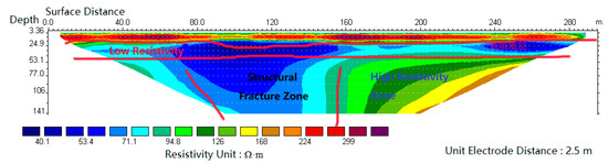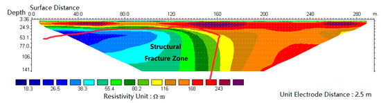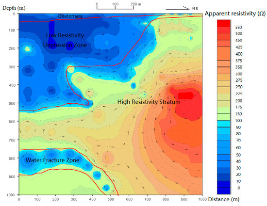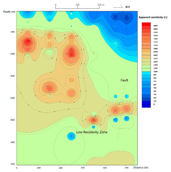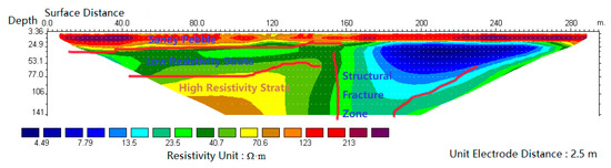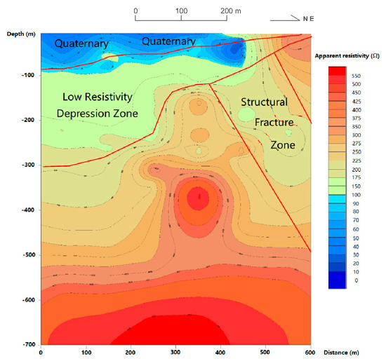 In the south bank of Sha River, a magnetotelluric sounding (EH-4) line with a length of 1000 m and a point distance of 50–100 m was arranged, and a total of 16 points were measured. The measured profile is shown in Figure 7. There is a depression with a depth of about 500 m from the starting point of the profile to 700 m, and there is a belt with a low resistivity at a depth of about 800 m. The Cagniard resistivity is 350 Ω·m. It is speculated that it is a water-bearing structural fracture zone, or the contact zone between the Mesoproterozoic intrusive rock and the metamorphic rock of Taihua Group. Because of the development of the original fracture and the influence of the later faults, the rock fracture contains hot water.