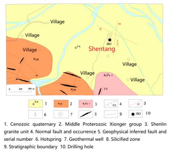 As shown in Figure 4, the main lithology of around Shangtang hotspring outcropping site was gneissic medium grain biotite potash feldspar granite unit (Pt2H1ξ), with an area of about 10 km2. The intrusions all extended along the direction of regional structural line in a very irregular long belt, and the internal contact of the sequence was not clear. The intrusions appeared intrusion relationship with around Taihua Group, early Proterozoic shibanhe gneiss, and Mesoproterozoic penggou unit. There were strong contact metamorphism around the rock mass, mainly tremolite, chloritization, and epidotization. The second unit also had epidotization and chloritization internal alteration. The ground surface of hot spring outcropped was covered by quaternary silty clay and sand gravel layer, and the thickness of quaternary exposed by drilling was 4.2 m.