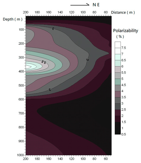 A quadrupole sounding and a polarizability test profiles were arranged in Shentang geothermal field, and the design value of sounding point distance AB/2 was 1000 m.