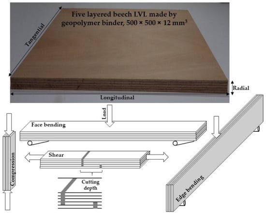 Laminated veneer lumber (LVL) using geopolymer as binder was made of five rotary-peeled beech veneer sheets under laboratory conditions. The binder was spread manually on ply faces using a brush. After binder application, five veneer sheets were parallelly oriented, layer by layer, forming the LVL panels. The ply stacks were then pressed in a laboratory single opening hot press (Höfer Presstechnik GmbH, Taiskirchen, Austria). For all LVL panels, the same hot-pressing schedule was applied. The applied pressure, temperature, and time of the press were 2 MPa, 140 °C, and 16 min, respectively. The panel thickness was also kept constant at 12 mm for all LVL panels made by geopolymer binders. The spread amount of the geopolymer binder was equal to 420 g/m2 on each glue line (500 × 500 mm2). Three LVL panels were manufactured for each of the variables according to Table 1, resulting in a total of 21 panels. Prior to any process step, both veneer sheets and produced LVL panels were conditioned at 65% ± 3% relative humidity and 20 ± 2 °C temperature for 2 weeks.