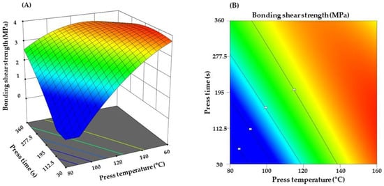 The interactive effect of hot-pressing temperature and time on the bonding shear strength of geopolymer binder determined by RSM simulation using the regression model, (A) three-dimensional picture and (B) two-dimensional picture.