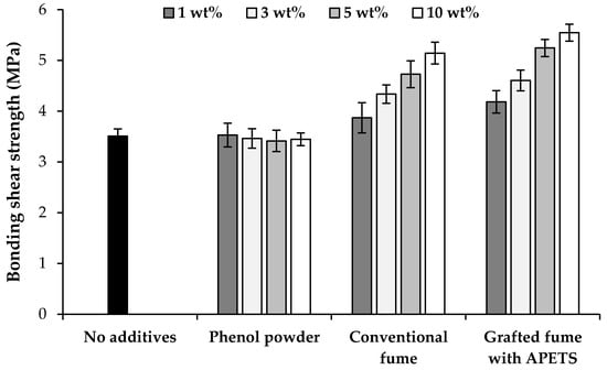 The highest bonding shear strength was observed with the addition of grafted silica fume with APTES. The bonding shear strength of the binder was increased by about 57% with the addition of 10 wt % grafted fume. Of course, a part of this shear strength increment was still related to the silica fume itself. The APTES as a grafting agent was also positively influenced by the bonding shear strength of the geopolymer binder. Notably, the APTES also improved the bonding mechanisms of geopolymer with wood. The fractured surface of the wood strips (Figure 4) showed that the common failure mode for geopolymer binder with phenol flakes and conventional silica fume was cohesion failure in the binder, as the binder was observed to stay on top of the two veneer strips. The failure happened in the wood section of the overlapping area in the case of grafted silica fume. This can be related to the improvement of bonding mechanisms between wood and geopolymer binder. The APTES could be converted into silanol and possibly linked to the wood surfaces [32].