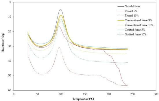 The DSC data are also presented in Table 4. The onset and peak temperatures of the reference geopolymer binder (no additives) were recorded at 79 °C and 98.8 °C, respectively, that is, somewhat like that of urea formaldehyde adhesive [5,40]. The onset temperature was not significantly changed with the use of various additives in the geopolymer formulation. The peak temperature of the geopolymer binder was not affected either after the addition of conventional and functionalized silica fume, whereas the addition of phenol flakes slightly reduced the peak temperature to about 95 °C. The curing reactions of the geopolymer binder was generally exothermic and became the main contribution to heat evolution during DSC measurements (Figure 5). The DSC results showed that the heat of reaction obviously decreased with the addition of phenol into the binder formulation. Conversely, the heat of reaction was slightly increased with the addition of both conventional and grafted silica fumes into the geopolymer binder formulation. This indicates that the final heat of reaction of the curing reaction of the geopolymer binders were strongly related to the types of additives. In other words, the heat release and reaction temperature depended notably on the raw materials, activators, and reaction conditions. The effect of the silica fume on the final heat of reaction of the curing reaction could be explained by the increase in the reactivity of reactive groups (fast formation of three-dimensional networks) in the curing system. The phenol flakes were negatively influenced by the binder characteristics and created the lowest heat of reaction during curing.