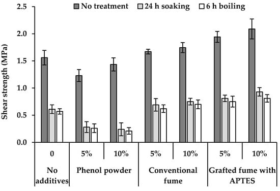 The shear strengths of LVL samples made of geopolymer binder with and without additives are shown in Figure 7. The shear strength values were significantly higher for the samples with no pretreatment compared to those that received the conditioning treatments of 24 h water soaking and 6 h water boiling that are indicators for determining their interior and humid applications, respectively. Referring to Figure 7, the samples experienced a severe change in condition after both water soaking and boiling pretreatments, which likely caused more moisture to penetrate the binder line and decrease the shear strength of the LVL samples. The average loss of shear strength after water soaking and water boiling pretreatments related to the untreated samples were about 50% and 60%, respectively. The areas exposed to moisture influenced the binder features, deteriorated the quality of geopolymer bonding, and, consequently, destroyed the bonding layers [9,13,28].