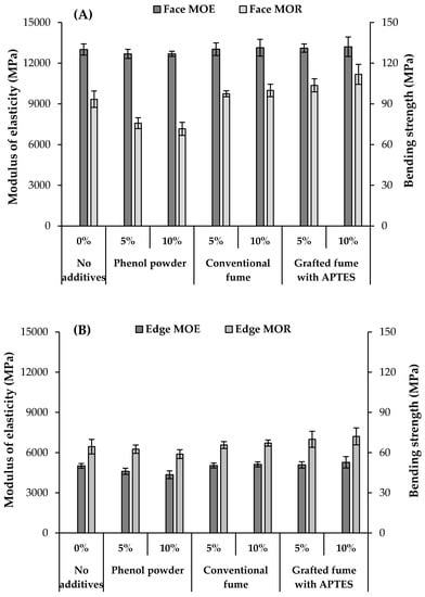 The average values of bending strength (MOR) and modulus of elasticity (MOE) in the bending of LVL samples in both face and edge directions are presented in Figure 8. It is obvious that the type of additives in the geopolymer binder affected the bending properties of the LVL samples. Referring to Figure 8A, LVLs made of geopolymer binder with no additives had a face MOE and MOR of about 13,000 and 93 MPa, respectively. The face MOE was not considerably changed by using various additives in the binder formulation. The face MOR was significantly reduced with the addition of phenol in the binder formulation, whereas the face MOR was increased about 20% with the addition of the grafted silica fume. In other words, the lowest value of face MOR was observed with a 10 wt % phenol usage (72 MPa), and the highest belonged to the sample with 10 wt % grafted silica fume (112 MPa). This result is also consistent with the trend observed in bonding shear strength of LVL samples. As was shown above, the shear strength values of LVL samples made of geopolymer binder with phenol were also the smallest due to the higher binder viscosity [12,30,39].
