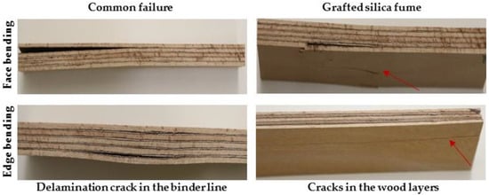 The failure modes analysis of the bending samples can also explain the effect of various additives on the bending properties of LVL samples. As stated in Figure 9, the common failure mode of bending samples was a delamination crack that extended longitudinally through the binder line of the LVL samples and significantly influenced the maximum failure load tolerance. This can diminish the bending strength of LVL samples. The bending failure was initiated in the wood layers of LVL samples made of geopolymer binder mixed with grafted silica fume (in both face and edge bending tests). This indicates the improved adhesion between the modified geopolymer binders with the wood constituents.