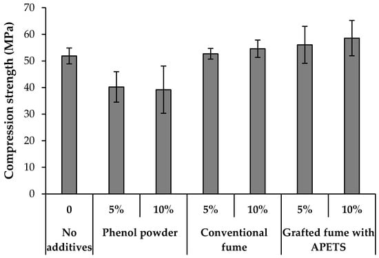 The optimum levels of pressing temperature (140 °C) and time (112.5 s) obtained by RSM modelling was used to evaluate the effect of additives content on the bonding shear strength of geopolymer binder using the ABES instrument (Figure 3). As shown in Figure 3, the additives content had obvious effects on the bonding shear strength. The shear strength of geopolymer binder with no additives was about 3.5 MPa. Adding various amounts of phenol flakes into the geopolymer binder formulation showed no significant influence on the bonding shear strength. The bonding shear strength of the reference binder was increased about 45% after the addition of 10% conventional silica fume, reaching a value of about 5.1 MPa. The higher the added silica fume, the higher the bonding shear strength in the geopolymer binder. The addition of silica fume to the binder formulation involved the modification of the geopolymer chemistry [15,31].
