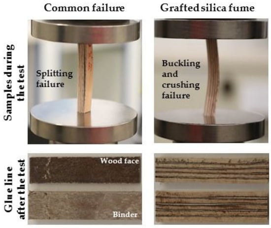 Failure modes were relatively consistent among groups of test specimens and can be seen in Figure 11. The common failure mode observed in most of the samples was splitting the layers at the geopolymer binder line that indicates a weak bond line quality. Specimens made with grafted silica fume generally started to fail in compression, after which they buckled to one side and compression creases were observed at the specimens’ face. This result is also consistent with that trend observed in bending tests of LVL samples, showing an improved adhesion between wood and geopolymer binder with grafted silica fume.