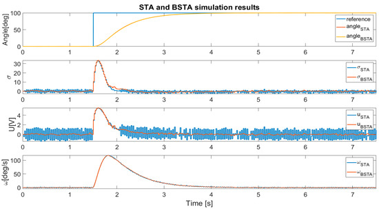 The simulation was performed by the Feedforward integration technique for the plant discretization and preselected solver-integration time, . The controller sampling time in the simulation, as well as in the experimental environment, was selected as, . Figure 4 and Figure 5 show the simulation results of the comparison between STA and BSTA controller techniques. For more realistic simulation, the measurement noise was added to the angle and velocity variable. The power spectra of the added Gaussian noise was 0.32.