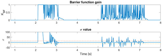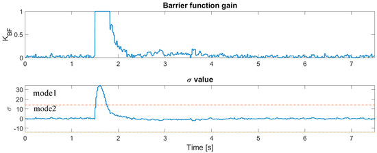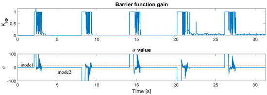 The convergence and stability of the BF adaptation approach are ensured if the is a strict positive semidefinite function; . From the expression Equations (25)–(27), it is obvious that the stability of the system is ensured if the sliding variable is smaller than the BF boundary . If the variable is getting closer to the , then the function converges to zero, and the expression Equation (27) holds if . The stability proof for BSTA is finished. In the presented paper, BF is used for chattering alleviation; therefore, the BF operation boundary is limited to the pre-selected value , Figure 2, where the chattering alleviation starts and holds, . For the smooth transition from STA to BSTA, or operation mode one to two, and, with regards to Figure 2 and Equation (19), the gain of Equation (20) needs to be selected as