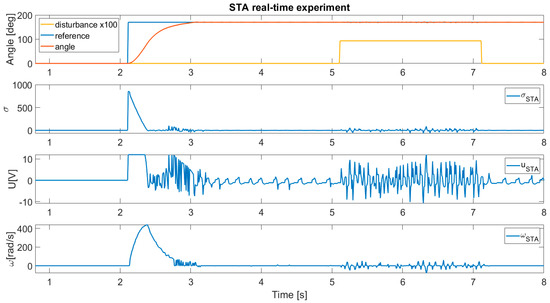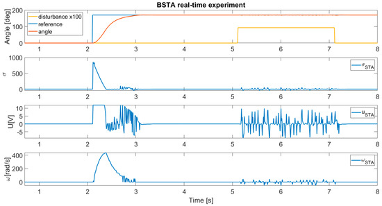 The tracking capability of the BSTA compared to the STA remained unchanged, which can be confirmed by the value in Table 4. It can be noticed that the controller output value is notably reduced, and the value of BSTA is remarkably smaller. After the tracking capability test, the disturbance suppression ability needs to be inspected. For the real-time experiment, the input disturbance is added to the system. For the given disturbance experiment, the input disturbance amount is 34% of the whole controller output span, and the stepwise function was used.