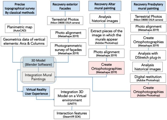 The virtual reconstruction project designed for the St Augustine church is grounded on detailed information compiled from historic records, art history research, photogrammetric and topographic surveys, antique photographs and digital image processing and analysis. Figure 2 shows the process used to recover and reconstruct the architectural structures and mural paintings from the ruins of a historic building, and visualize them within an interactive virtual reality environment.