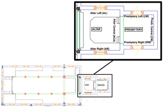 First, to establish a general overview of the area, the researchers performed an analysis of the orthographic images obtained for the three presbytery facings (LW, CW, RW—Figure 7).