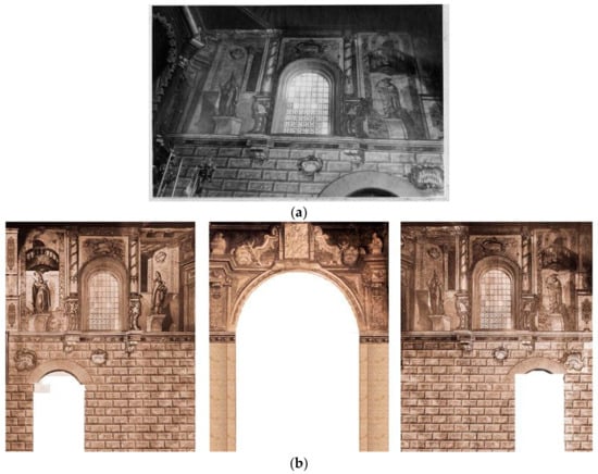 Stage two—historical archives review. This stage involved studying historical records and antique photographs. Among these antique photos, researchers found photographic records of the altar facings (Figure 6a), previously thought to have been lost. This discovery assisted the team in recovering damaged images, correctly aligning them, and correcting distorted perspectives. However, as the photos were in black and white, it was not possible for the team to correctly identify the mural colour schemes. Researchers did not have the same luck with the presbytery, as it only appeared in photographs indirectly by way of chance.