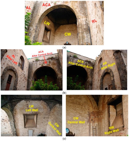 (a) Wide-angle shot of altar and presbytery, (b) First body—Altar: left facing (AL), right facing (AR) and central arch (ACA), (c) Second body—Presbytery: left facing (LW), central facing (CW) and right facing (RW).