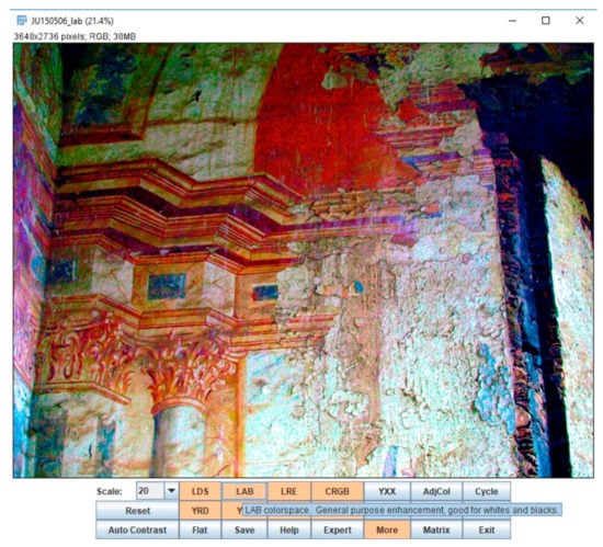 The established processes used to recover and restore murals and frescos require specialist techniques and equipment that is extremely expensive, e.g., gas chromatography mass spectrometry, optical microscopy, scanning electron microscopy, infrared spectroscopy, microchemical analysis and X-ray diffraction []. When it comes to recovering pictorial art, the digital imaging tool DStretch® has proven to be an excellent alternative to such expensive techniques and methods []. Although originally designed for rock art researchers, DStretch® has also been used to study faded murals [], frescos [] and even images obscured by smut and grime []. In yet another demonstration of its potential, it has also been used to recover information about polychrome on antique ceramic []. By artificially enhancing hidden or discoloured traces of pigment, DStretch® reveals details in photographs that are hidden to the naked eye [].