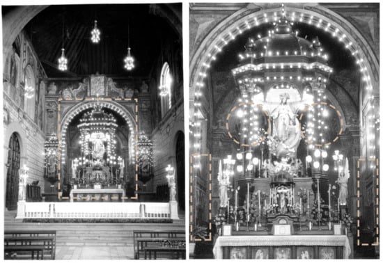 The research produced a 3D model of the church and a virtual reintegration of the altar facings (AL, AR and ACA—Figure 7) using the orthographic projection of images obtained from antique photographs.