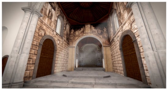 In the professional world, VR technologies have proven apt for cultural heritage preservation and have become a powerful tool for professional conservator-restorers, archaeologists and the suchlike. Such professionals, having completed the necessary groundwork and research, can use VR to restore elements found to be in a state of ruin or disrepair []. As such, VR can be used to assist in conserving, reconstructing, documenting, researching and promoting cultural heritage. Different methods can be used to obtain 3D models [], and graphic engines for videogames can be used to add factors to virtual environments, such as interactivity, visualisation and realism [].