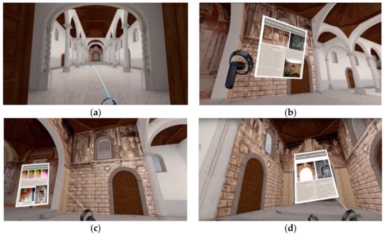 Virtual interactive actions developed for the program: (a) teleportation, which allows the user to move around the scene, and (b–d), selection by pressing the virtual button, which allows the user to view specific information on the church.