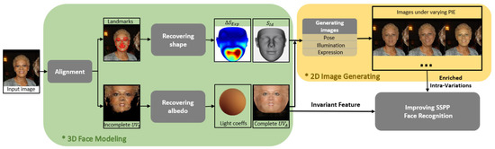 Figure 1 shows the framework of the proposed method for single sample per person face recognition. The method consists of three modules: 3D face modeling, 2D image generation, and improved SSPP FR. Given a face image of a person, we detect 68 landmarks, U, and generate the incomplete UV map of texture (Incomplete ) using PRNet algorithm in [] at first. We then recover its 3D face shape and complete UV map of albedo (Complete ), respectively, from landmarks and Incomplete . With the recovered properties, images under varying pose, illumination, and expression are generated in the 2D image generation module. Finally, in the improved SSPP FR module, the reconstructed Complete and generated images are used to assist SSPP face recognition. Next, we detail: (i) albedo recovery; (ii) shape recovery; (iii) data enrichment; and (iv) SSPP FR.