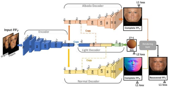Inspired by Sengupta et al. [], we propose an end-to-end network that can recover the missing part in the incomplete and generate its complete version . As can be seen in Figure 2, we concatenate the incomplete with its horizontally flipped image as input of the network. The proposed network follows an encoder–decoder structure, in which the encoder module extracts a common feature from input image, and the albedo decoder and the normal decoder decode the complete albedo and the complete normal from the common feature, respectively, and the light decoder computes the spherical harmonics illumination coefficients from the concatenation of common feature, albedo feature, and normal feature. At last, following Equation (2), a rendering layer is used to recover the texture based on the above decoded attributes.