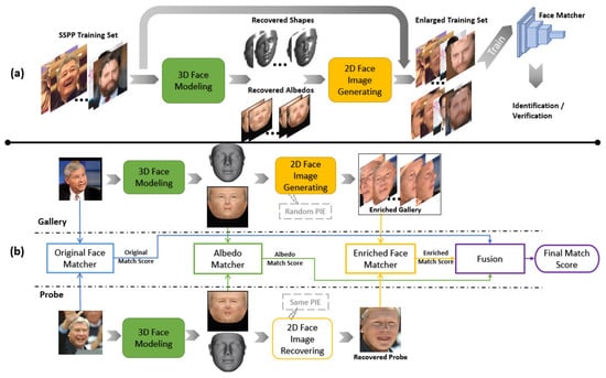 In SSPP FR, performance of face matcher drops due to the deficiency of intra-variation. One implementation to improve SSPP face recognition is to enrich intra-variation in training set via 3D-modeling-based image generation. As shown in Figure 3a, 3D face modeling module is used to recover shapes and albedos of SSPP training set, based on which additional face images with varying pose, illumination, and expression are generated. Finally, the enlarged dataset of original and generated images is utilized to train a more discriminative face matcher.