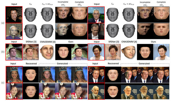 Figure 4a shows recovered 3D face shapes and complete for four input face images in LFW. It can be found that our method can not only reconstruct the albedo of the visible area but also recover the albedo of missing part. We also compared our 3D face modeling method with two existing methods [,]. Figure 4b shows the comparison results for two input images. As can be seen, the 3D face shape and albedo map reconstructed by Sengupta et al. [] are incomplete and cannot be used for data augmentation, and the results recovered by Tran et al. [] are poor in reserving identity-related appearance feature due to the limited representation capacity of PCA bases. Figure 4c shows some generated face images of varying illumination (Columns 3 and 8), pose (Columns 4 and 9), and expression (Columns 5 and 10) of four different subjects.