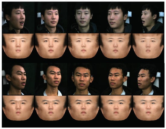 where R is the rotation matrix calculated from the pitch, yaw, and roll angles; f is the scale factor; and is the translation vector. Thirdly, we generate texture T with random illumination through Equation (2), where N is calculated by the obtained , A is constructed from , and is randomly generated. Finally, and T are used to render the final image by orthographic projection matrix and z-buffer.