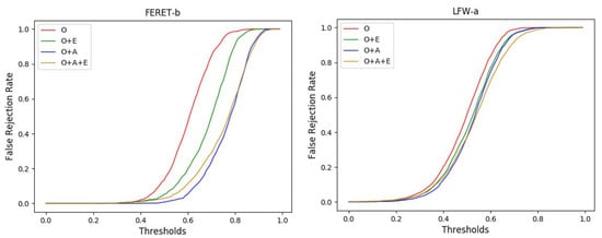 We trained the implementation of our proposed method with enriching intra-variation (see Figure 3a) by using the above training sets and evaluated its face verification performance on seven of the benchmark datasets, i.e., LFW [], CPLFW [], CALFW [], AgeDB [], CFP [], VGGFace2-FP [], and FERET-b []. During the test, the features extracted from the images by the network were used to judge whether two images are from same persons based on the cosine similarity between their features. Here, ten-fold cross validation was employed. Specifically, we divided the dataset into ten subsets, nine of which were used as the training set and the remaining one used as the test set.