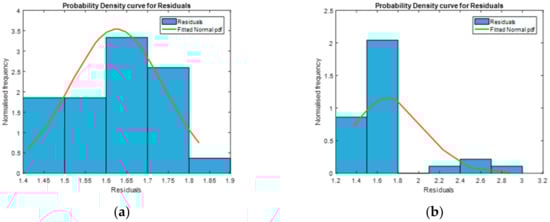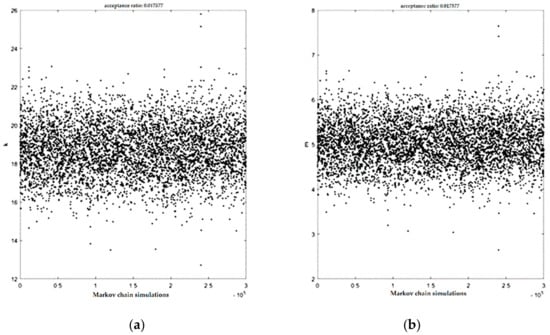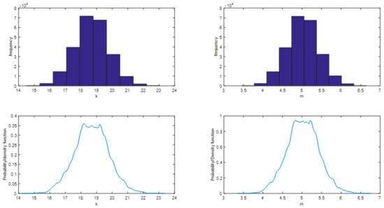 The Markov Chain Monte Carlo simulation results in Figure 5a show that is mostly in the interval 18–19, and in Figure 5b, is close to 5, which is in agreement with the fixed value used for MLM. It should be noted that is assumed fixed in the reliability section. The Posterior marginal density function is also shown in Figure 6.
