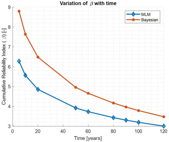 The cumulative reliability index along the service life of the structure is presented in Figure 8 for the case where uncertainty in vehicle number is 1% and CoV for is as 0.39 (MLM) and 0.2 (Bayesian).