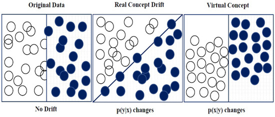 Based on the cause and effect of these changes, as shown in Figure 1, two types of drift are identified: real drift and virtual drift [8,11,12]. Real drift is defined as changes in . Note that such changes can occur with or without changes in ; thus, they may or may not be visible from the data distribution without knowing the true class labels. Virtual drift is defined as changes in the or class distributions that do not affect . As we are mostly interested in the effect of concept drift on classification, we focus on methods that use true class labels to detect drift. We, therefore, concentrate mainly on real drift, regardless of whether they are visible from the input data distribution .