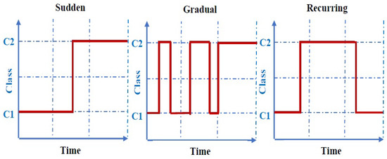 Furthermore, in terms of class distribution, researchers differentiate how these changes happen, as shown in Figure 2. A sudden/abrupt drift happens when the source distribution in at a moment in time t is suddenly substituted by another distribution . Gradual drift is connected with a slower rate of change and it refers to a transition stage where examples of two different distributions and are mixed, whereas in recurring drift, after a period of time, previous concepts may reappear again. We emphasise that the proposed drift detector has been designed mainly for sudden/abrupt drift.