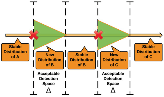 Regarding the evaluation process, recall the four requirements which need to be met by a model that operates in a nonstationary environment, hence we evaluate our detector and the competitors as shown in Figure 4. Figure 4 illustrates the DMDDM-S evaluation. The straight arrow represents the main stream of incoming data and the crosses show the real position of drifts. We calculate the delay of drift detection by defining a value that represents the length of an acceptable drift delay. This value works as a threshold to locate the distance of the detected drift from the real position of the drift. Therefore, by considering this value , we describe the following measures.