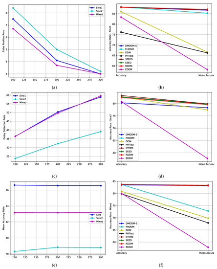 Regarding false alarm, DMDDM-S has relatively high readings, due to the parameter sensitivity of DMDDM-S. For example, as shown in Figure 5a,c, increasing (100–200–300) will entail fewer false positives (as shown in Figure 5a) but might delay change or miss detection (as shown in Figure 5c), resulting in a trade-off between false positives and delay change detection.