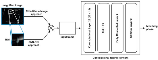 We propose a CNN that receives an input image of the video magnification and returns an output class representing ‘I’ or ‘E’, as shown in Figure 2. The input image is resized to the fixed dimensions pixels. The topology of the CNN consists of: an input layer that receives a grayscale image, a convolutional layer with 25 filters of size with a rectified linear unit (ReLU); then, there is a 2-size fully connected layer that feeds a SoftMax layer; and finally, a classification layer is occupied to compute the corresponding output class. Finally, we obtained a temporal vector labeled in each frame position as ‘I’ or ‘E’. In Figure 3 we show the topology of the CNN including the two strategies for training the network: the CNN-ROI and CNN-Whole-Image approaches.
