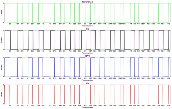 In Figure 5, we show the tagged results obtained for each approach with Trial 1 of Patient 7 in ‘LF’ position. The first row shows the tagged reference, where the x-axis indicates the frame number where the breathing changes from inhalation (‘I’) to exhalation (‘E’) or vice versa. The next rows show the tagged estimation for each approach, where both the MVC and MV approaches overcome the approach that uses the original video as input to the CNN.