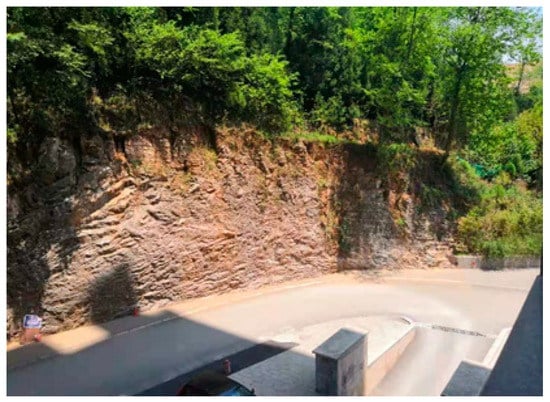 The tunnel site is a tectonically denuded middle mountainous area. The overall terrain is low in the south and high in the north. The highest northern point is at the top of the mountain, while the southern slope toe is a residential area road, as shown in Figure 1. The slope toe is excavated to form a high slope that is approximately 40 m in height. With an average slope angle of about 82°, the slope is rather steep. The tunnel is located inside the slope, whose orientation is nearly parallel to that of the slope.