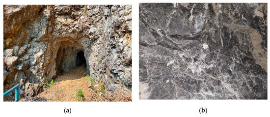 The planned tunneling site passes through the limestone stratum in the Lower Permian Qixia Formation. As the field investigation revealed, the underground water in the tunneling area is mainly carbonate karst fissure water, according to the lithology and water-bearing characteristics of the aquifer (layer) group. The main manifestations of karst are dissolution pores and cracks. According to the in situ exploration and drilling, the dissolution pores and cracks of rock core are generally 1–6 cm in size, precipitation of calcite crystals is present, and the karst caves are not exposed. Investigation of the ground surface and tunnel exit cliffs found no development of karst caves, as shown in Figure 3a.