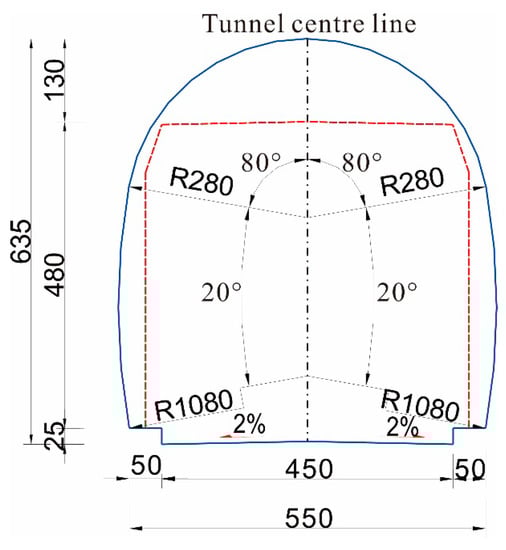 There is a pedestrian passage that was manually excavated in the 1980s in the planned tunnel site. The bedrock is bare, with a sectional size of 1.5 m (width) × 2.2 m (height). A new horseshoe tunnel with a length of 100 m and a sectional size of 5.88 m (width) × 6.35 m (height) is planned in the area. Figure 4 illustrates its sectional diagram.
