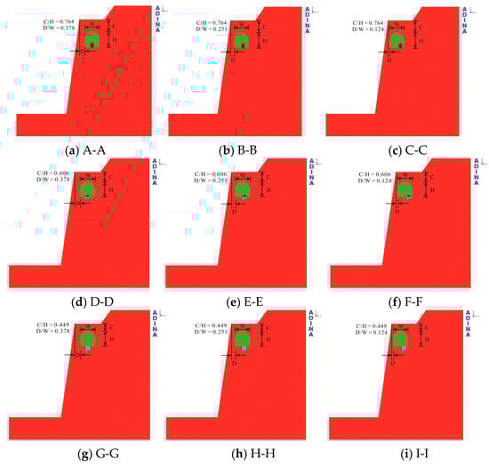Since the new tunnel is close to the surfaces of the slope and ground, conducting a systematic study on the spatial positions of the new and existing tunnels is necessary on the premise of considering the in situ construction conditions comprehensively. In principle, the shallower the overburden of the new tunnel, the smaller its distance from the free face of the slope, and accordingly, the lower the construction cost. However, huge potential risks will be faced regarding engineering safety. Conversely, if the engineering safety is guaranteed, the construction cost will increase substantially. Furthermore, the surface load is also a crucial factor since the overlying road cannot be closed during construction. Meanwhile, whether concrete backfilling for the existing tunnel is implemented or not will also affect the displacement field distribution of the surrounding rocks after the tunnel excavation. Thus, whether backfilling of the existing tunnel is implemented is also included in the numerical study, and the backfill material is the same as the lining concrete material. Hence, this study needed to consider nine relative spatial positions of the new tunnel, three magnitudes of the surface load, and two backfilling conditions of the existing tunnel, which constitute a total of 54 models. Figure 5 illustrates the tunnel relationships under nine different spatial positions.