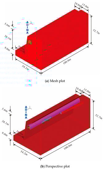 The computational time was 80 steps for all numerical models, with a single step length of 1. All odd-numbered computation steps simulated the rock mass excavation, while the even-numbered computation steps simulated the support structure generation. The rock masses (existing tunnel backfill concrete) were simulated with solid elements, whereas the lining structure was simulated with shell elements. A Mohr–Coulomb model was employed for the rock masses, while the elasticity constitutive model was used for the lining and backfill concrete. Table 4 and Table 5 list the main computational parameters of the finite element models, where the rebar in Table 5 were used for locally reinforcing a small part of broken weathered rock at the tunnel portal section. The presence of these rebar was omitted in the numerical model, since the use of rebar was not considered in the design of the tunnel trunk supporting structure. Nevertheless, providing their mechanical parameters was still necessary. The permitted displacement boundary conditions were: no horizontal displacement down the all-vertical mesh boundaries, no vertical and horizontal displacement along the bottom boundary of the mesh, and freedom to displace along the top boundary. The total number of elements in each model was between 840,000 and 870,000 for all models. All the models were built by ADINA software (Version: 9.1.3, Chongqing University in Chongqing, China).