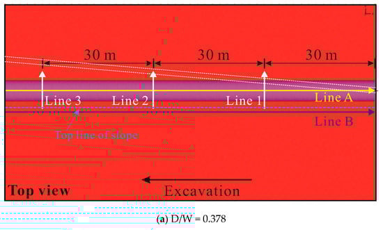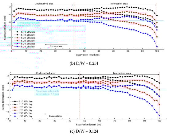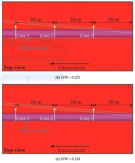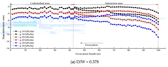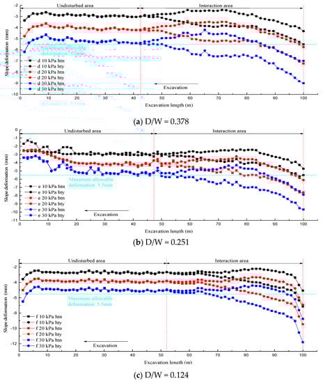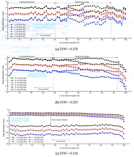 The slope deformation trends reflected in Figure 20, Figure 21 and Figure 22 are fundamentally analogous to the vertical settlement laws of the ground surface, which was attributed to the continuous coordinated deformation of the surrounding rocks. The trends of the slope deformation again explained why the intersection between the two tunnels was the sensitive zone affecting the surface settlement and slope deformation. As shown in Figure 21a–c, with the decrease in the D/W ratio, the boundary between the non-disturbed and interaction zones also increased slightly in the opposite direction of the excavation. Hence, further screening of a feasible construction plan is needed based on the slope deformation values in different conditions.