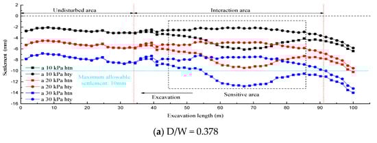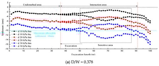 Figure 8 displays the final vertical settlement trends of the ground surface corresponding to different D/W values at C/H = 0.764. In the figure, the abscissa represents the construction distance and the ordinate represents the settlement value. Furthermore, A-A represents the model shown in Figure 5a, 10 kPa represents the surface load magnitude, “htn” denotes that the existing tunnel was not backfilled, and “hty” denotes that the existing tunnel was backfilled. It is noteworthy that the model disallowed octahedral meshing due to the small angle skew of tunnel and the geometrical characteristics of the shallow burial and slope adjacency. Meanwhile, the change in the tunnel position will force a remeshing by the ADINA software since the model enabled the face-link forced-mesh continuity function. In other words, the mesh density was mandatorily and automatically adjusted by the software rather than being specified by manual code. It was thus normal for the simulation curves to have slight fluctuations.