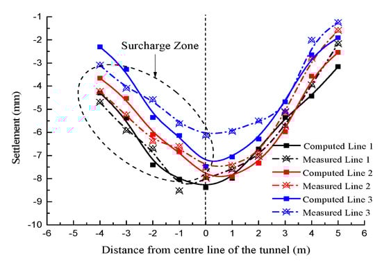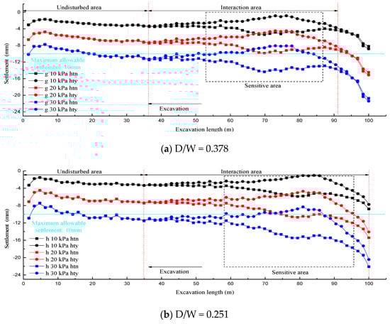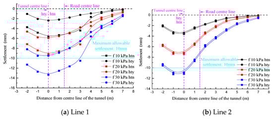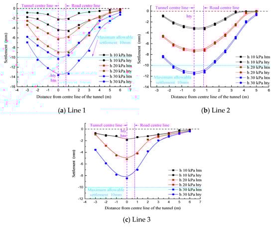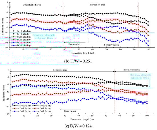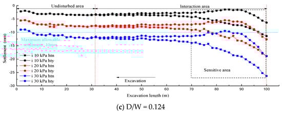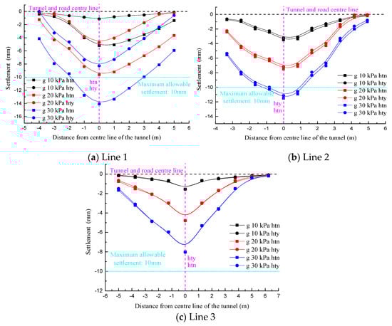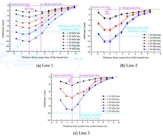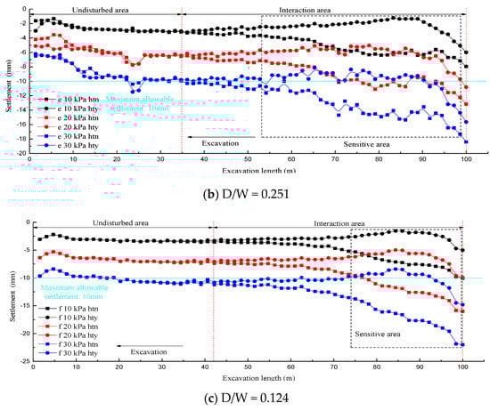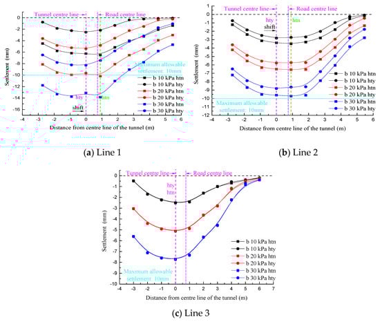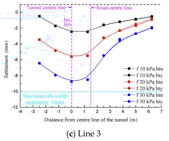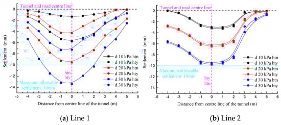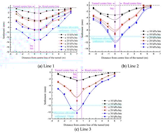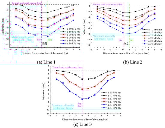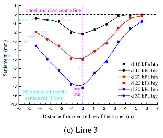 When D/W = 0.251, lines 1 and 2 were deviated from the tunnel axis such that the symmetry axis of the settlement curve was biased to the left of the road centerline in the “hty” condition. In contrast, in the “htn” condition, the symmetry axis of the settlement curve was biased to the right of the road centerline. Moreover, in view of the far smaller sectional size of the existing tunnel than the new tunnel, the eccentricity of the settlement curve symmetry axis in the “htn” condition was significantly lower than that in the “hty” condition. On the other hand, the symmetry axes of all the settlement curves for line 3 shown in Figure 12c coincided with the tunnel center, which were still located on the left side of road centerline as well. The settlement value was affected only by the surface load magnitude.