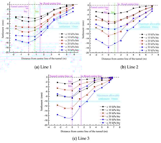 With the decline of the C/H ratio to 0.606, the difference in the settlement caused by the “hty” and “htn” conditions was also widened, and the maximum surface deformation at line 1 could be up to 13.4 mm, as shown in Figure 14a. However, under a fixed C/H ratio, the maximum settlements at lines 1–3 decreased sequentially with the increasing spacing between the tunnels. As the overburden of the new tunnel became shallower, the intersection area between the existing and new tunnels shrunk. Thus, the difference in settlement resulting from the existing tunnel being backfilled for line 2 was weakened compared to Figure 11b. Moreover, as shown in Figure 14b, Figure 15b and Figure 16b, the symmetry axes of the settlement curves were no longer obviously affected by the existing tunnel. The settlement differences in Figure 14c, Figure 15c and Figure 16c were even less apparent due to the tunnel spacing. Figure 15 shows a similar law to Figure 14, despite the symmetry axes of all settlement curves coinciding with the tunnel centerline, and their deviation distance from the overlying road center was 0.75 m. In Figure 16, such a deviation increased to 1.5 m.
