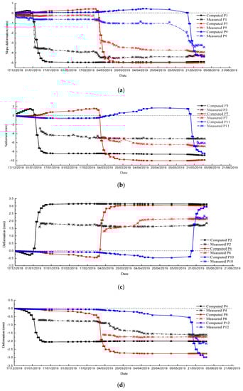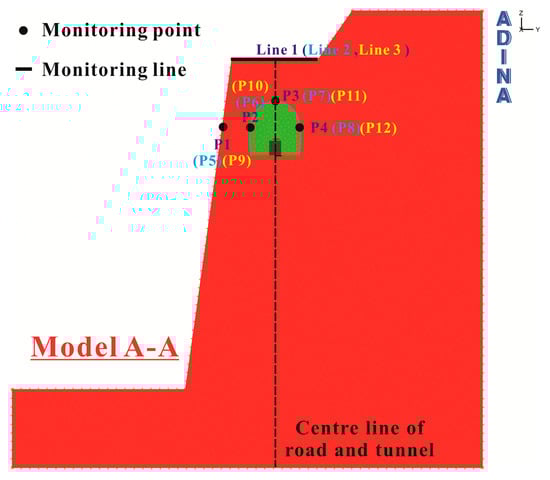 To verify the correctness of the simulations while ensuring the engineering safety, long-term, real-time monitoring was implemented over the deformation of slope, overlying road and surrounding rocks, and Figure 23 displays the specific locations of the monitoring points. At an excavation distance of 30 m, a horizontal settlement monitoring line was arranged on the ground surface, which included 10 monitoring points (completely corresponding to the line 1 of the numerical model). The monitoring point P1 was put on the outer slope surface of the tunnel sidewall directly below line 1 for monitoring the horizontal deformation of the slope. Points P2 and P4 were put on the left and right sidewalls of the tunnel, respectively, for monitoring the horizontal displacement of the sidewalls. Point P3 was put on the roof of tunnel. In the same way, a monitoring line (comprising 10 points in total) was arranged on line 2 in the numerical model, which corresponded to monitoring points P5–P8 at the slope and tunnel interior. Based on the simulation results, the critical area with the largest deformation was chosen as the monitoring point arrangement area such that the monitoring results were highly representative.