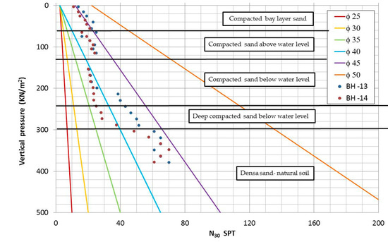 The Figure 2 below shows the available SPT indexes with respect to the effective pressure at vertical axil. Soil layers are included, defining which are above and below water level. The chart also includes the framework proposed by Sousa [6], by which internal friction angle of a granular material depends on vertical effective stress and SPT index.