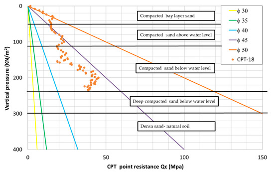 The CPT records are also presented within the framework of interpretation of the values of the angle of internal friction given by the abacus of Robertson & Campanela (1983) (Figure 3) [1].